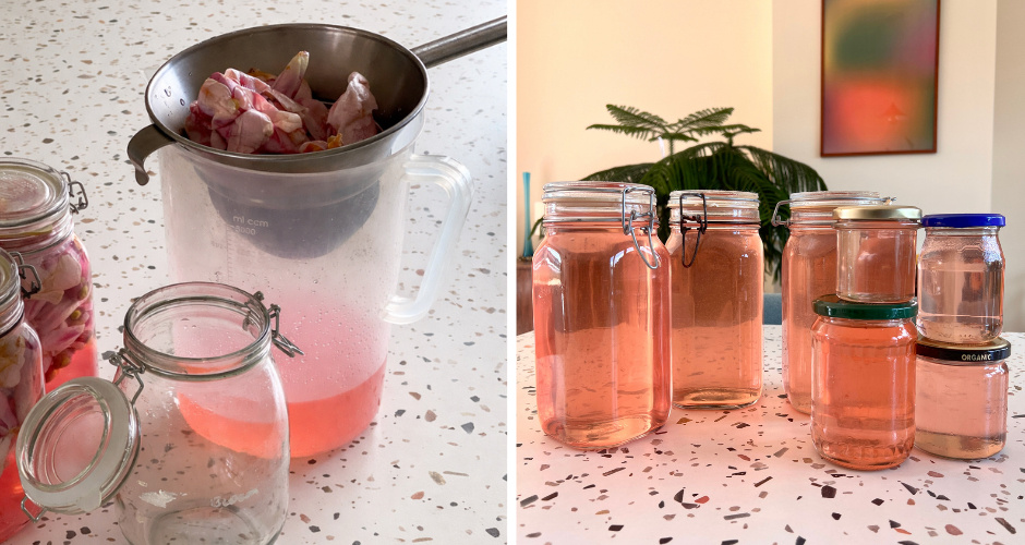1. Doe de bloemen in een of pan of weckpot en voeg een liter water toe. Dit zou voldoende moeten zijn om de bloemen onder water te zetten. Voeg het citroensap toe (dit zorgt voor een mooie roze kleur!). Laat dit mengsel 24 uur afgedekt staan op kamertemperatuur.
